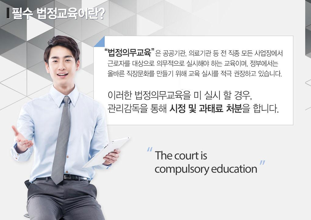 | 사업주는 법 제13조에 따라 직장내 성희롱 예방을 위한 교육을 연 1회 이상 하여야 한다. | * 1년에 1회 교육실시 * 300만원 이하의 과태료 |